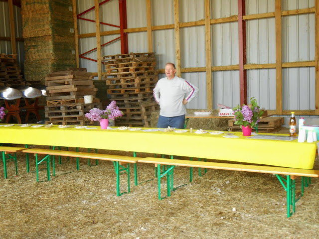 Nous étions attendus ensuite sous un hangar où tables et bancs avaient été installlés le tout décoré joliment avec des bouquets de lilas .