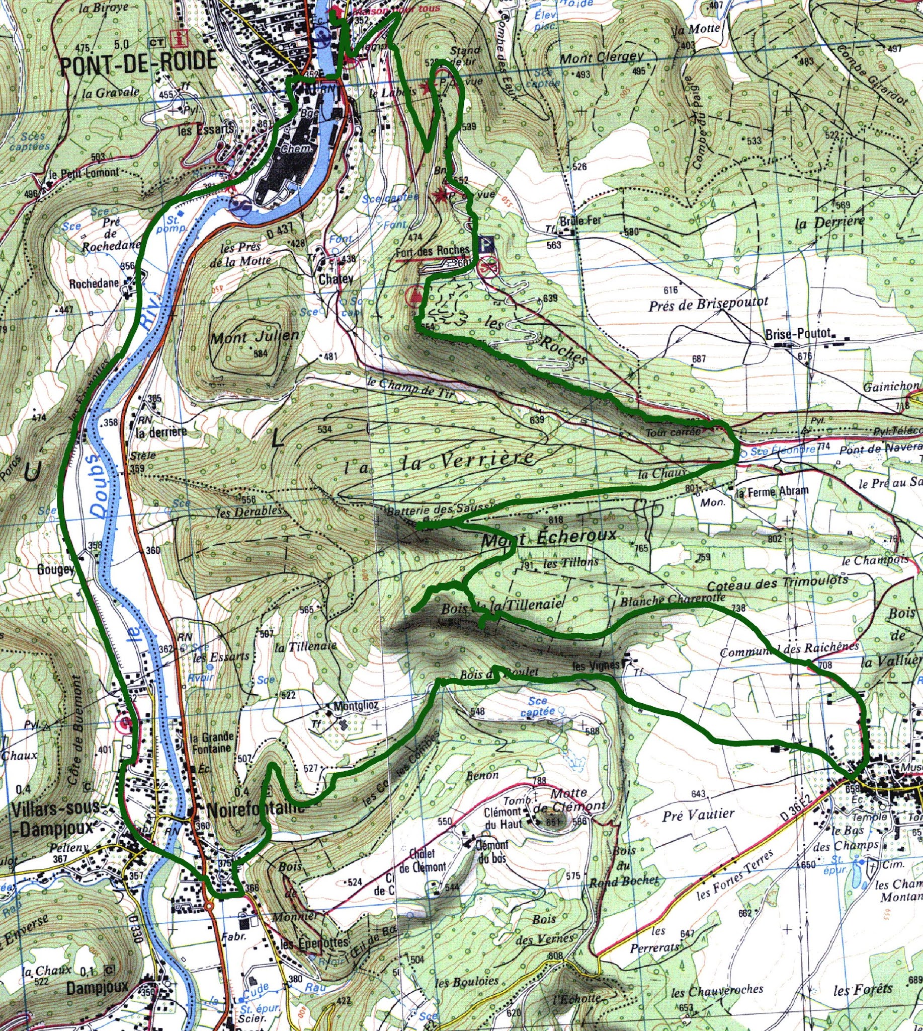 Dans le programme de Michel la Rando était relativement juste en ce qui concerne le dénivelé positif 450 m au lieu de 500 m programmé, mais sur la distance il s'est un peu planté ce n'était pas 16 km mais 22 que les 10 participants ont parcouru en direction de Montécheroux en longeant le Doubs au départ de la MPT jusqu'à Villars S/ Dampjoux et une belle grimpette bien à l'ombre de cette belle matinée en direction de la ferme Monglioz, puis un peu de répi pour rejoindre le village de Montécheroux par les prés Vautier puis remonter sur le Mont Echeroux et les belvédères pour notre casse croûte du midi sous quelques gouttes de pluie , retour par la Tour Carrée cet observatoire dominant le plateau d'Ecurcey et défendu pendant la seconde guerre mondiale par les Maquisards du Lomont, retour en descente par le sentier de Roches et son Fort pour rejoindre la MPT.